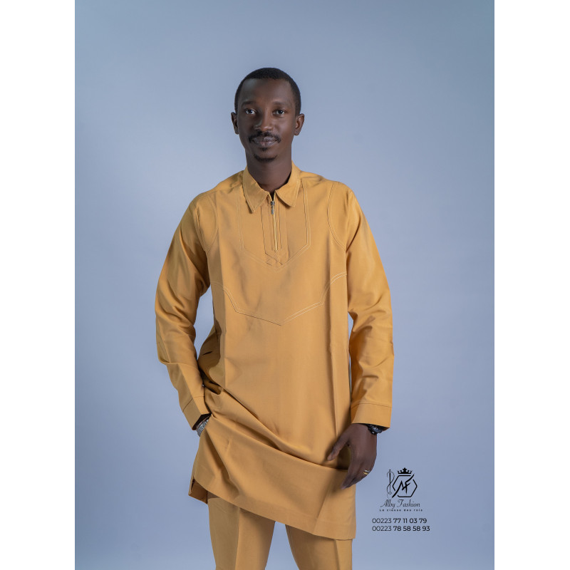 Apportez une touche de modernité et d’élégance à votre garde-robe avec cet ensemble traditionnel pour homme couleur ocre doré. Cette tenue se distingue par son design contemporain qui allie parfaitement tradition africaine et style moderne.