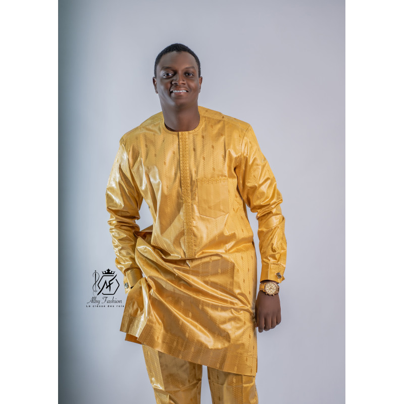 Sublimez votre style avec cet ensemble traditionnel pour homme couleur doré, une tenue qui symbolise le prestige, l’élégance et la noblesse de la mode africaine. Confectionné dans un tissu jacquard haut de gamme, ce modèle offre un aspect brillant et raffiné qui attire immédiatement le regard.