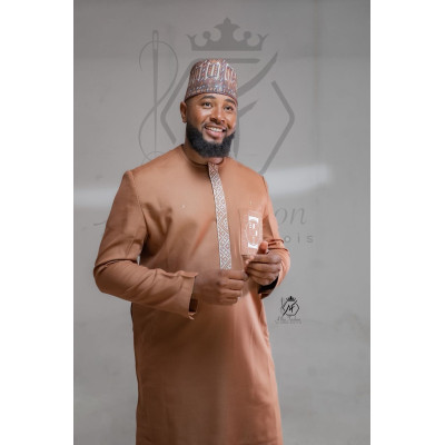 Le boubou "Abou" est une tenue moderne et sophistiquée qui allie la tradition à l'élégance contemporaine. Confectionnée dans un tissu de qualité supérieure, cette tunique couleur camel offre un confort exceptionnel et une coupe impeccable qui met en valeur la silhouette.