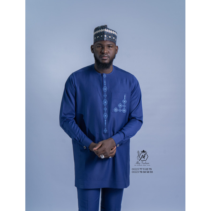 Affirmez votre style avec cet ensemble traditionnel pour homme couleur bleu nuit, une tenue qui incarne l’élégance, la sobriété et le prestige de la mode africaine moderne. Confectionné dans un tissu de qualité supérieure, ce modèle se distingue par sa coupe élégante et ses broderies raffinées qui apportent une touche d’authenticité et de sophistication.